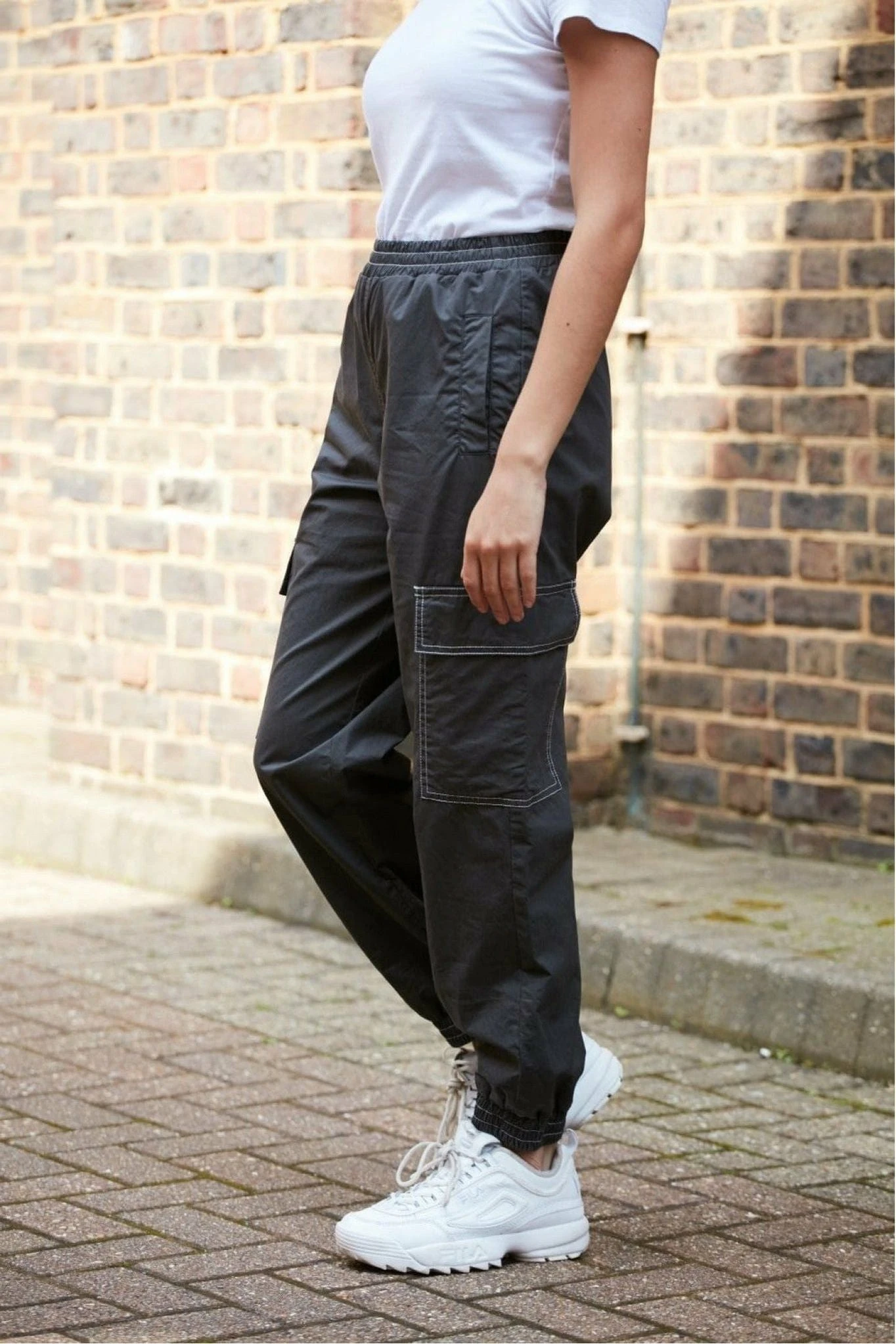 These charcoal grey washed cotton cargo trousers are perfect for casual days and can be dressed up for a dressier look. They boast off-white contrast stitching with cuffed hems and welt pockets.
