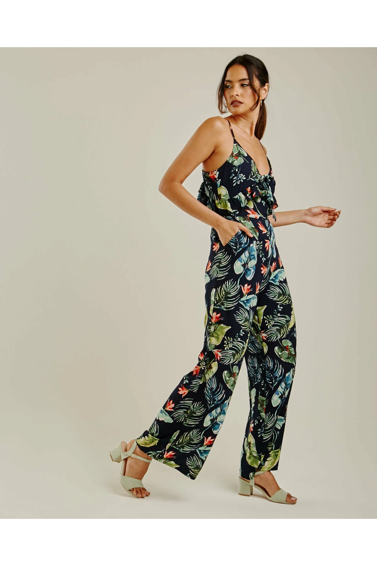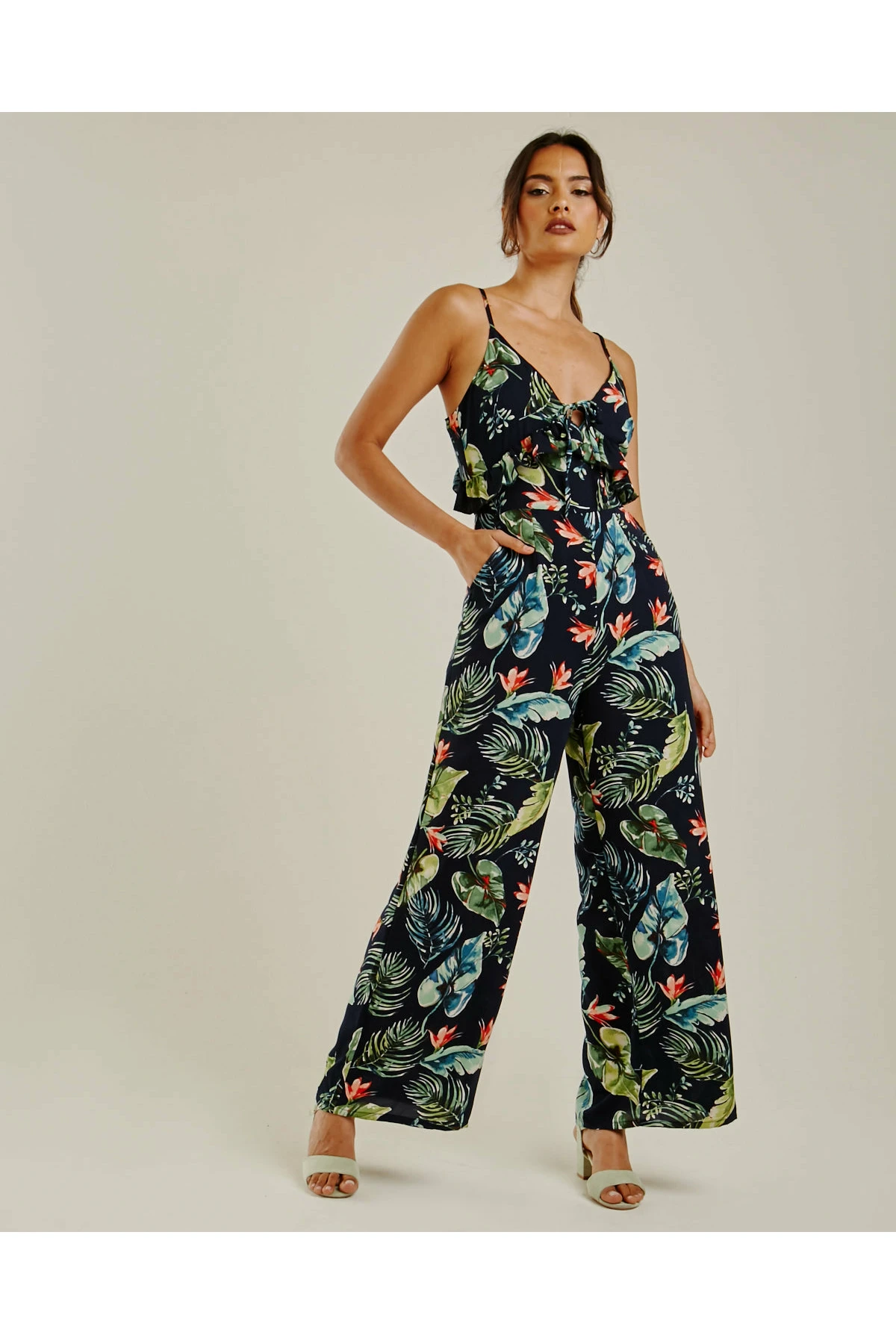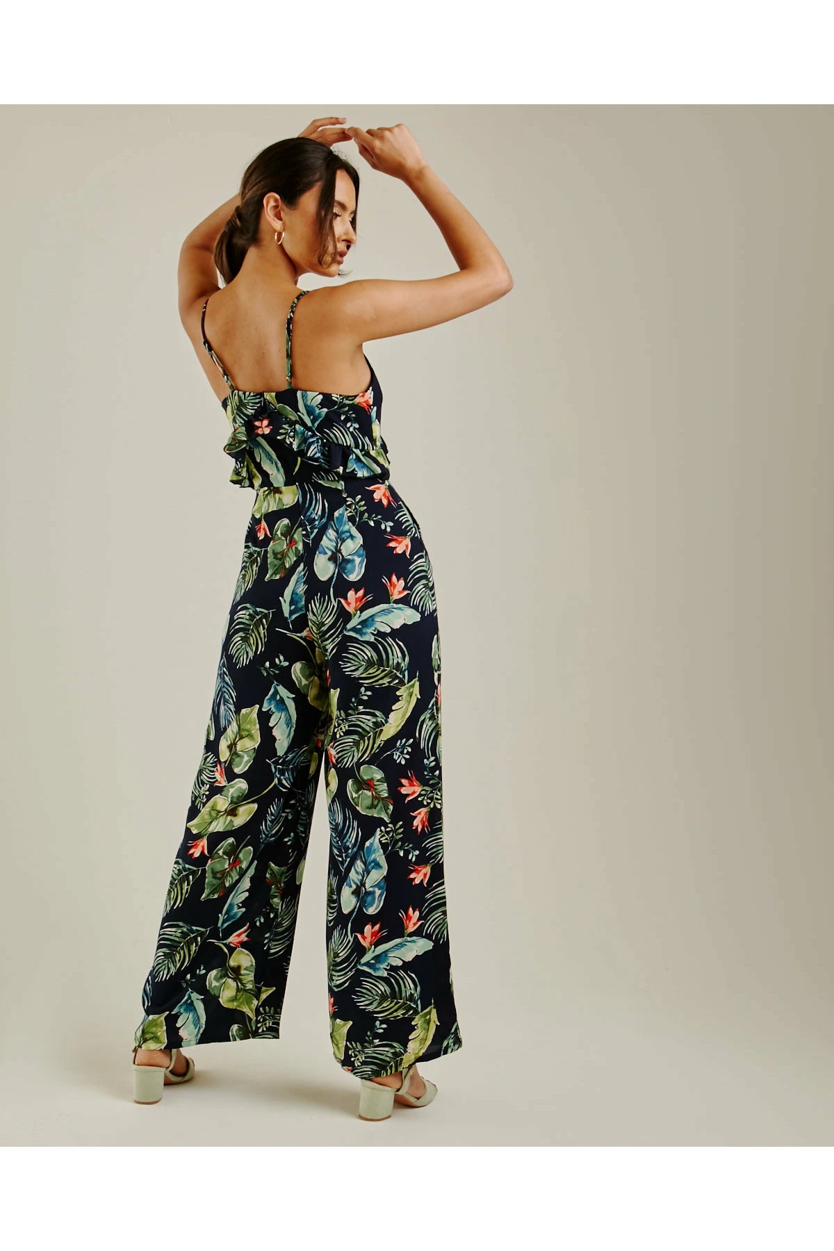 Dusty Pink Tropical Print Ruffled Jumpsuit | Dark Blue
