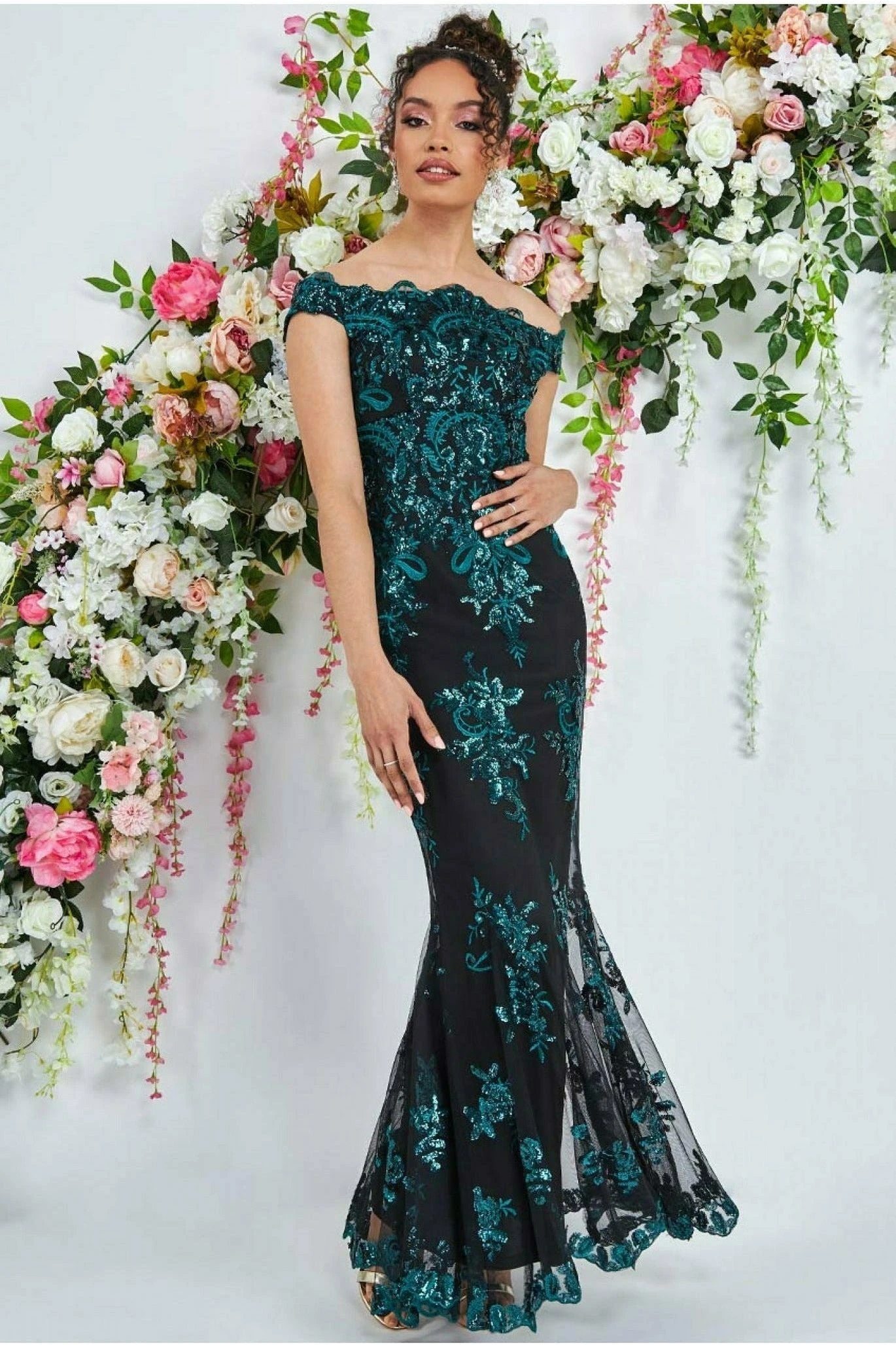 Goddiva Bardot Sequin Embroidered Maxi Dress – Emerald Green