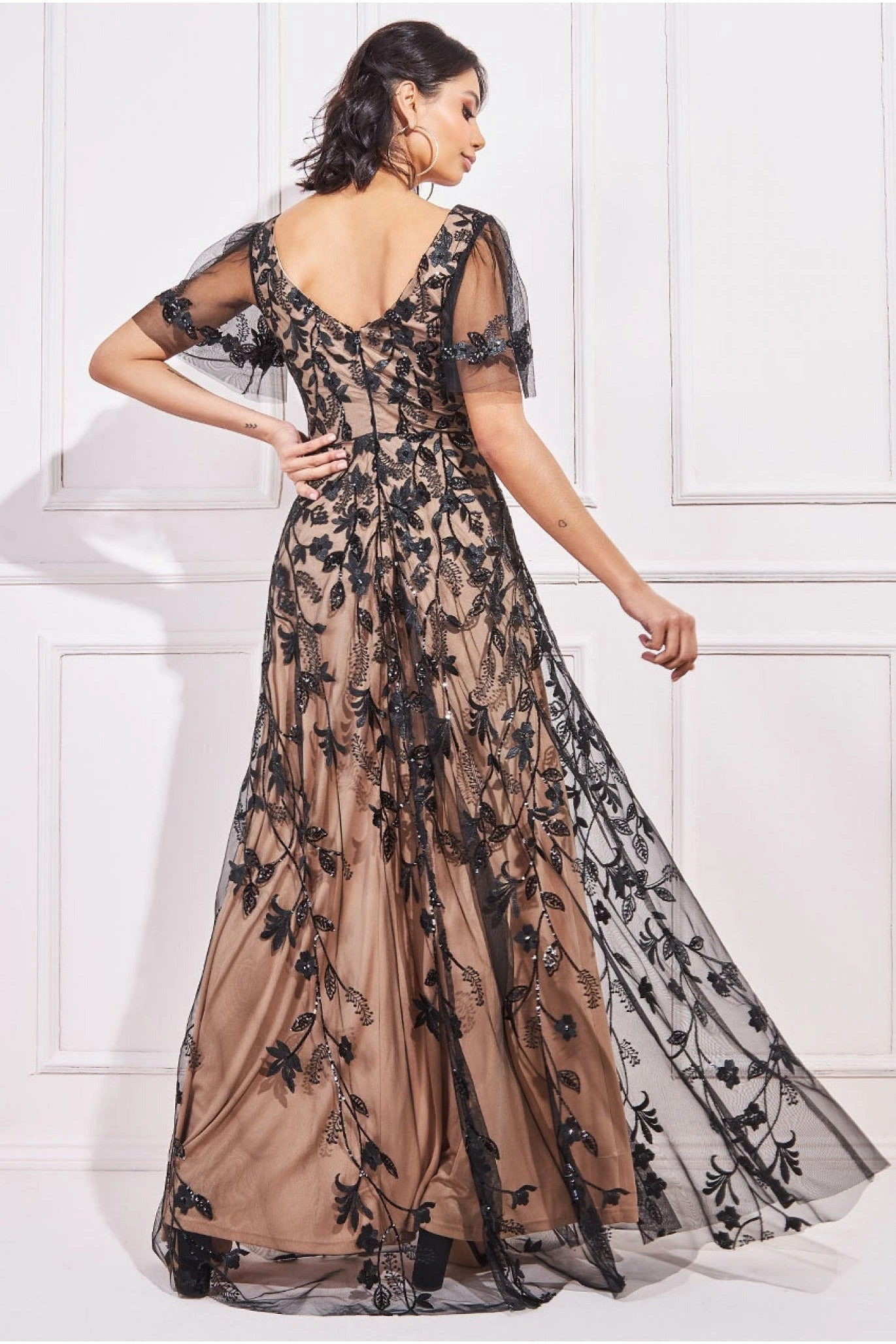The flared sleeve embroidered maxi dress from Goddiva is a beautiful dress that can be worn for almost any special occasion, whether it is for a black tie party, prom or wedding. This black long dress is the perfect combination of elegance and trendiness. The striking, v-neckline that extends to the bust area creates a playful look while the mesh overlay adds flare. The unique flutter sleeve feature is what makes this dress stand out from the rest. This long occasion dress is a perfect pick for mothers of the bride (or groom), prom and of course bridesmaids. In its gorgeous black colour, you can’t go wrong with this number.