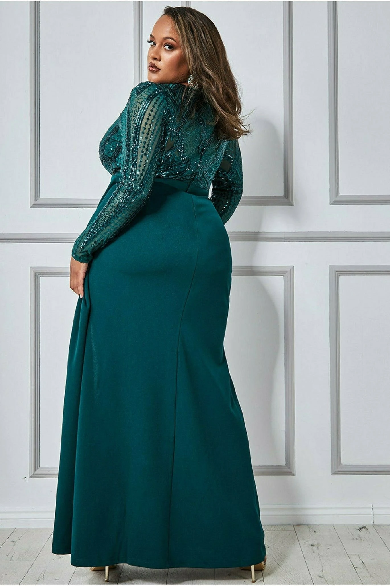 Goddiva Plus Sequin Bodice With Front Frill Maxi – Emerald
