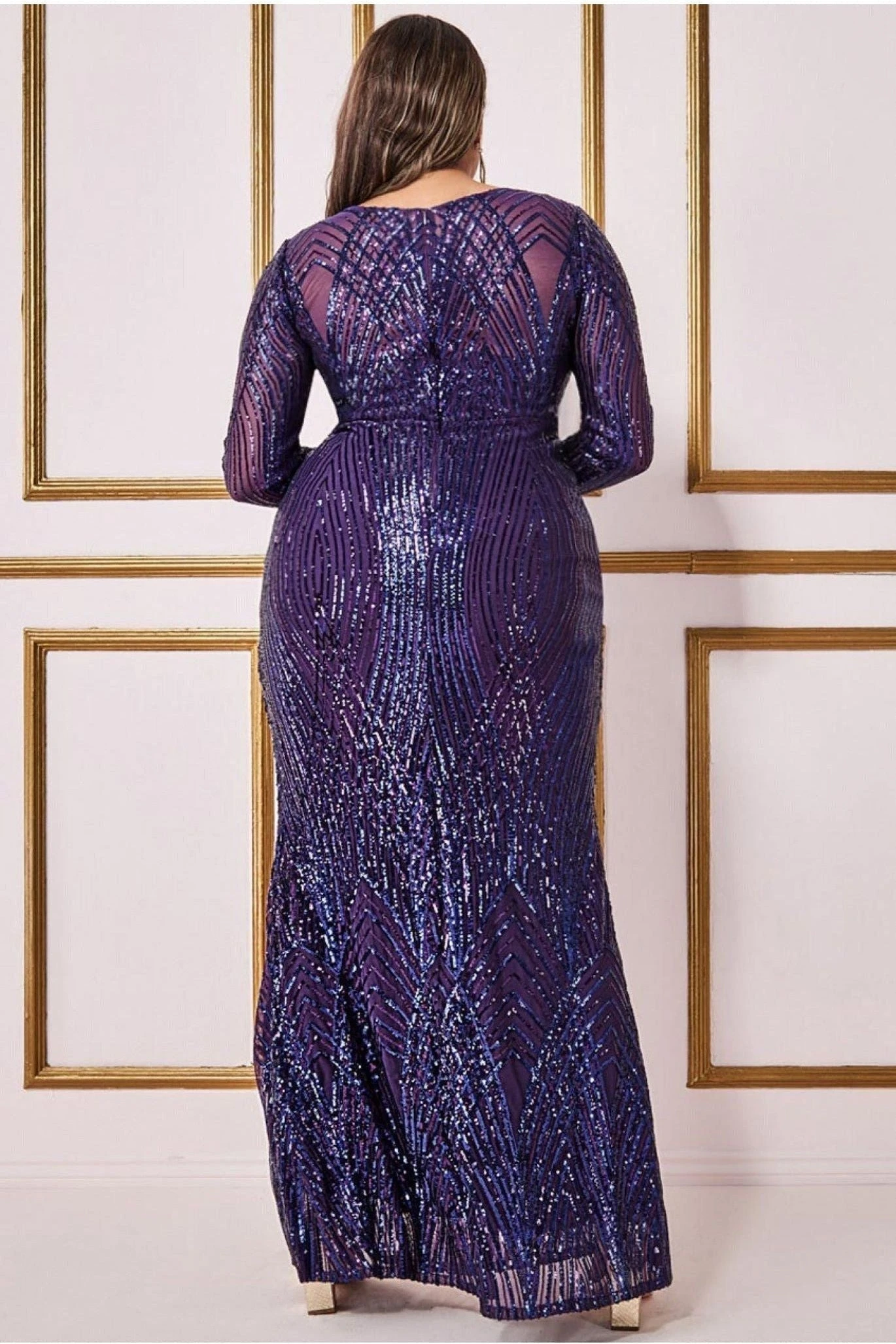 A dazzling plus size evening dress that will leave you feeling like a true diva. With its two tone sequins and fishtail hem, it is not hard to see why this aubergine piece is a must have for your collection. The v neckline gives this dress an edge and makes it perfect for those special occasions when you want to stand out from the crowd. Ideal to wear on Christmas day, New Year’s eve parties and any other festive occasion. In its classic purple colour this sparkling curvaceous evening dress is the perfect fit for black tie events, mothers of the bride & groom, prom and so many other occasions. Teamed with an updo, heels and clutch bag, this long sleeve purple occasion fuller figure dress will have you feeling like the belle of the ball.