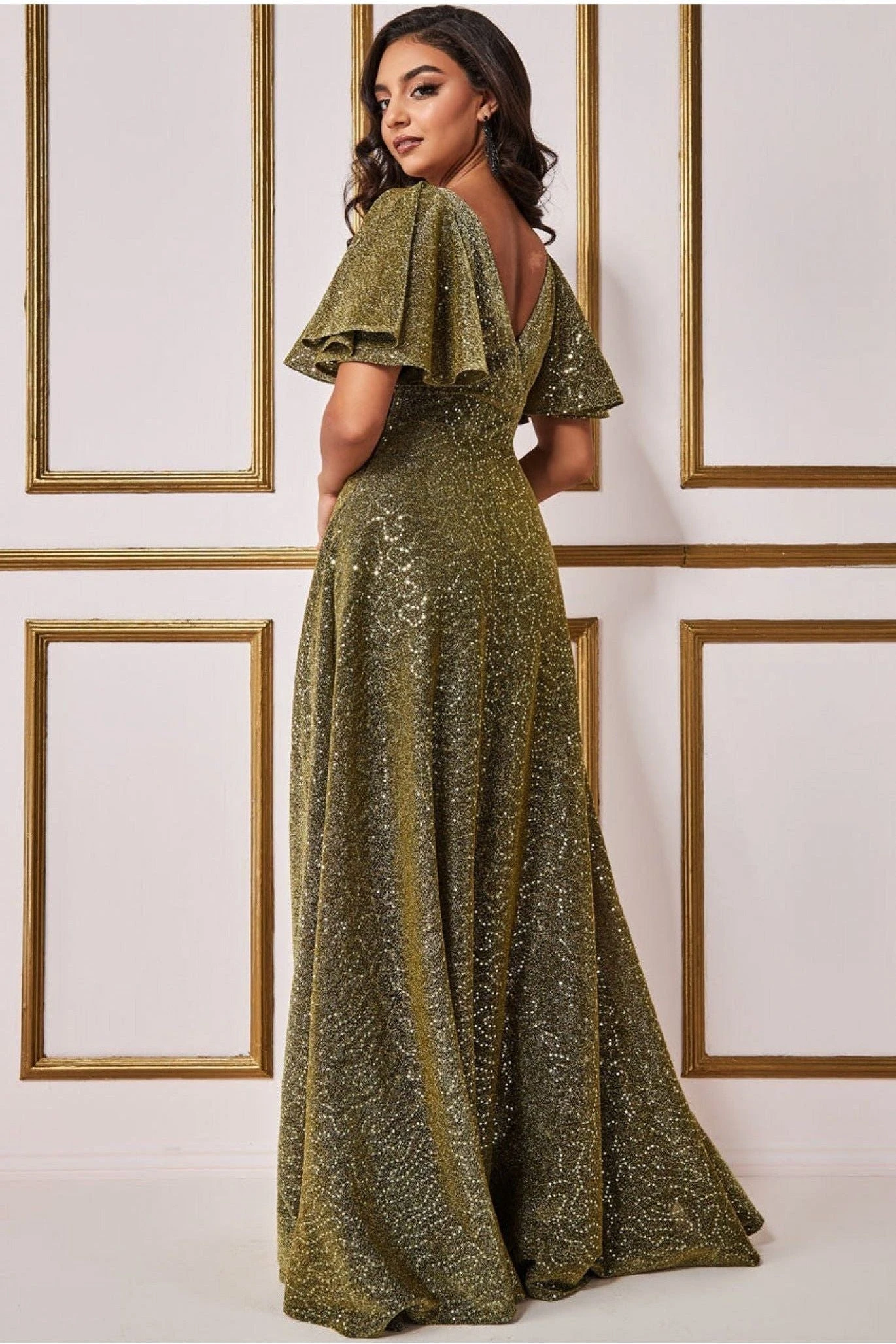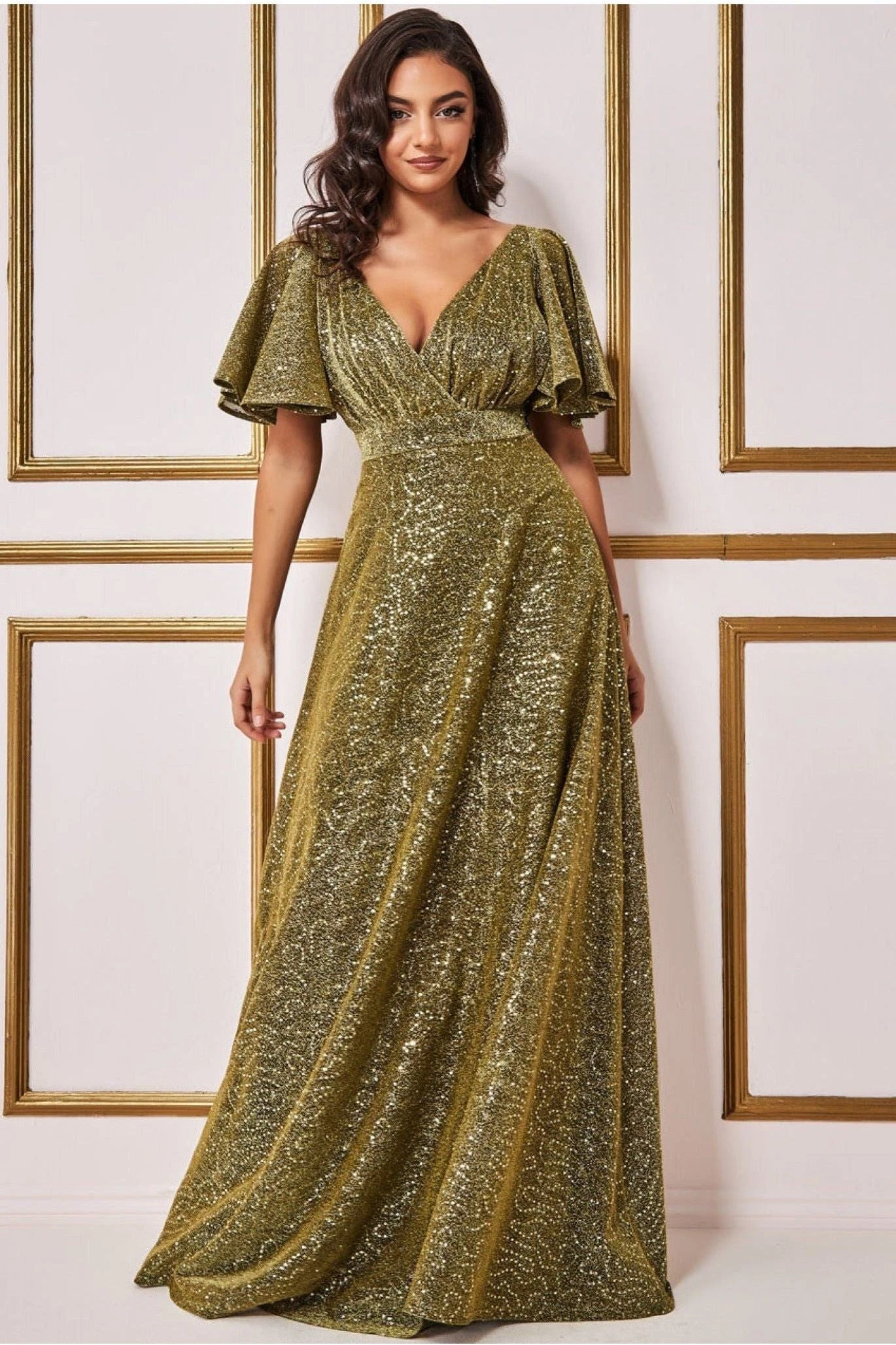 Goddiva Sequin Lurex Flutter Sleeve Maxi Dress – Gold