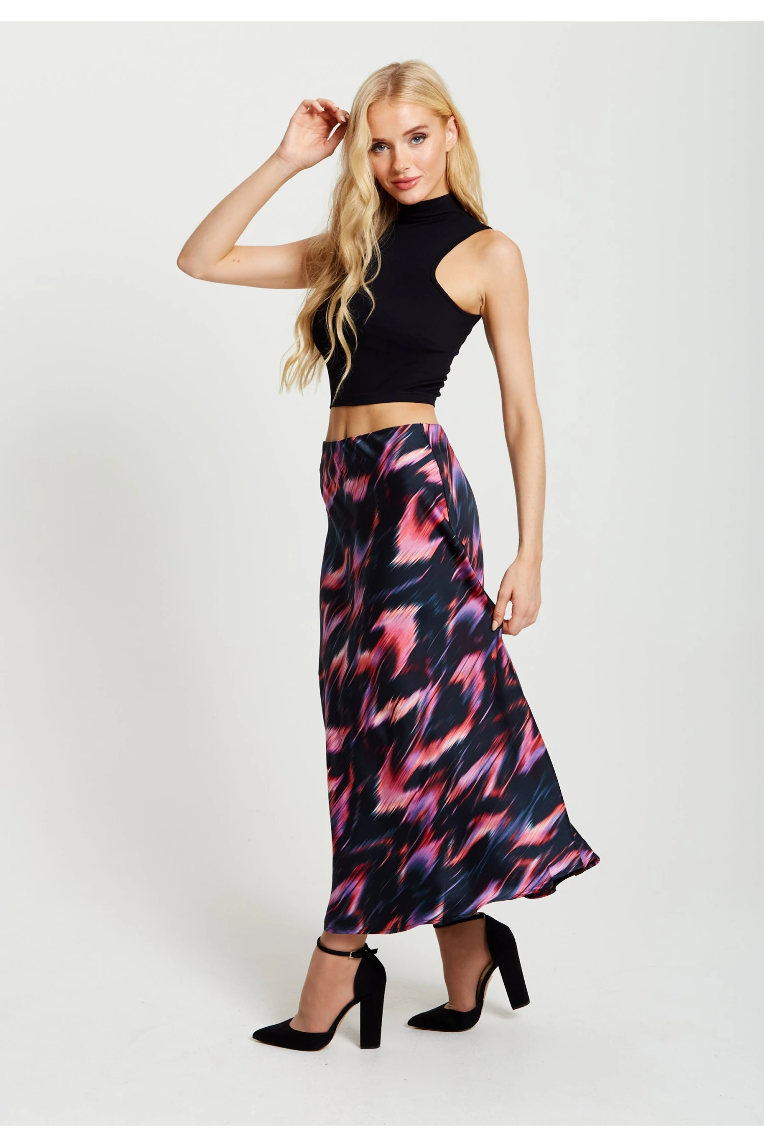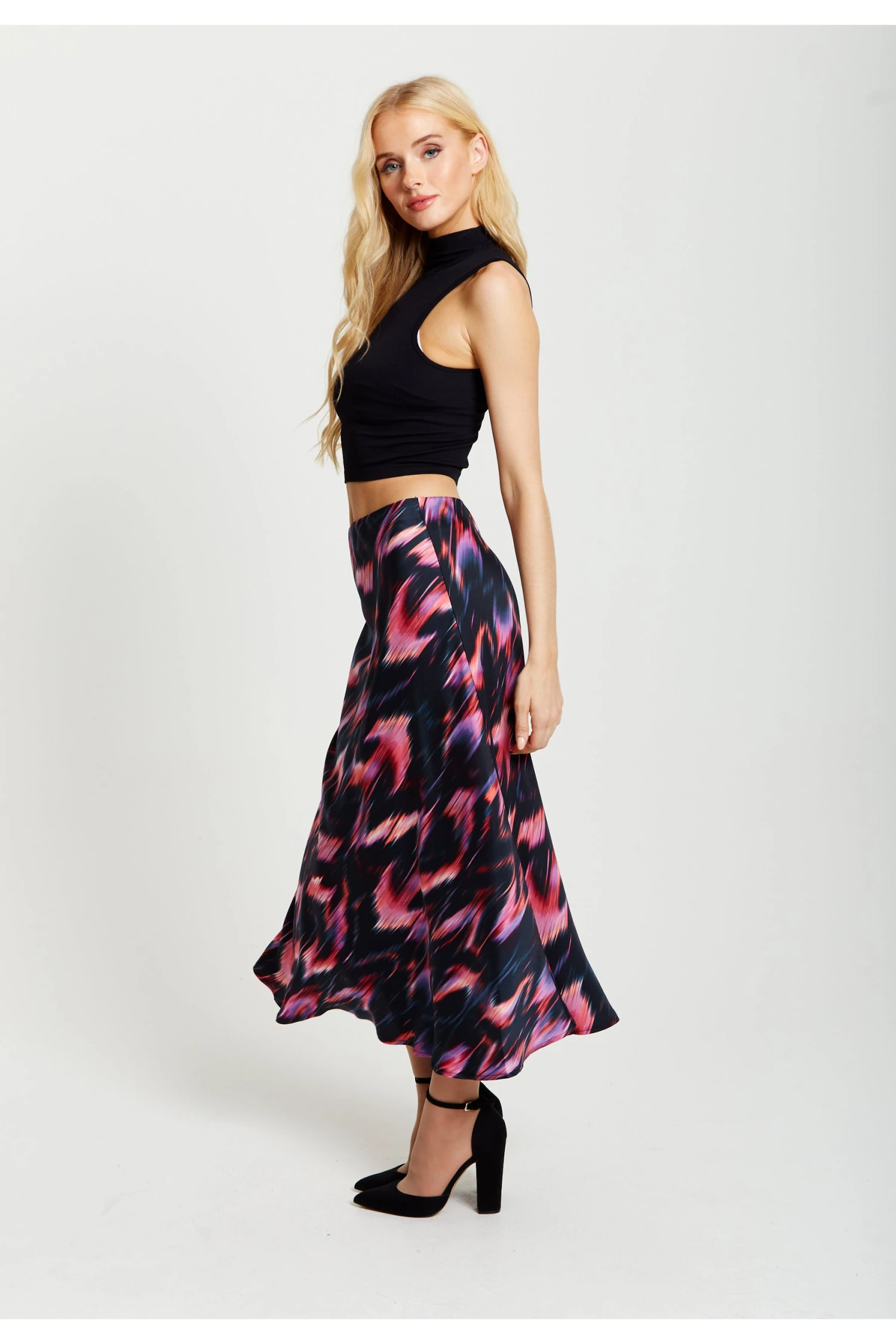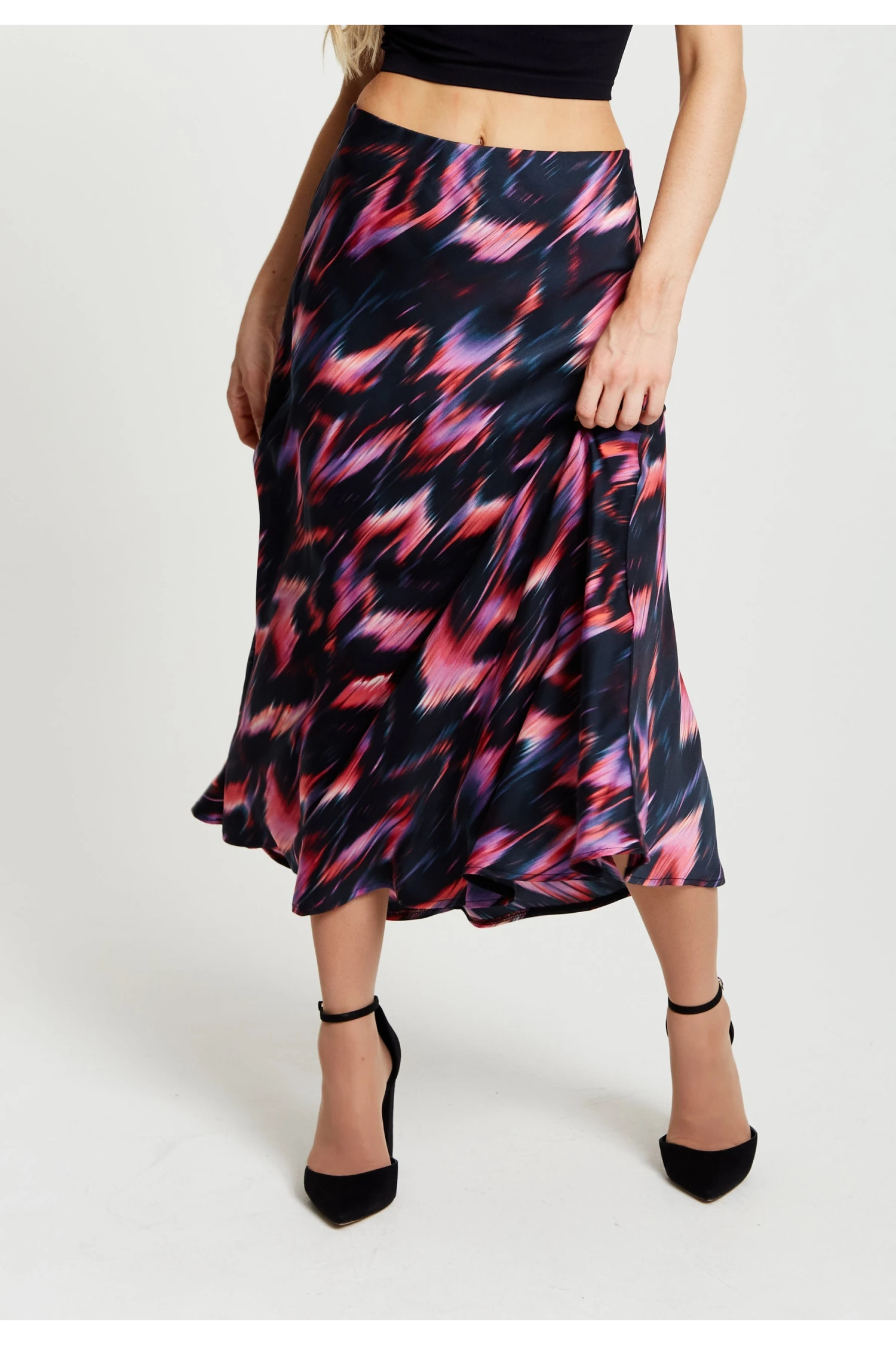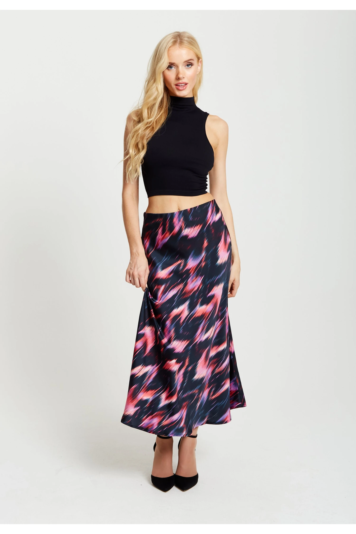 The perfect staple piece for Autumn/Winter, this high waisted skirt with an elasticated waist band can be styled with a huge range of pieces. Pair with our Liquorish Abstract Feather Print Shirt for a dramatic effect or a cosy cropped jumper and some boots for a relaxed everyday look. The abstract feather print has accents of warm vibrant colours which pop against a dark black backdrop.Â