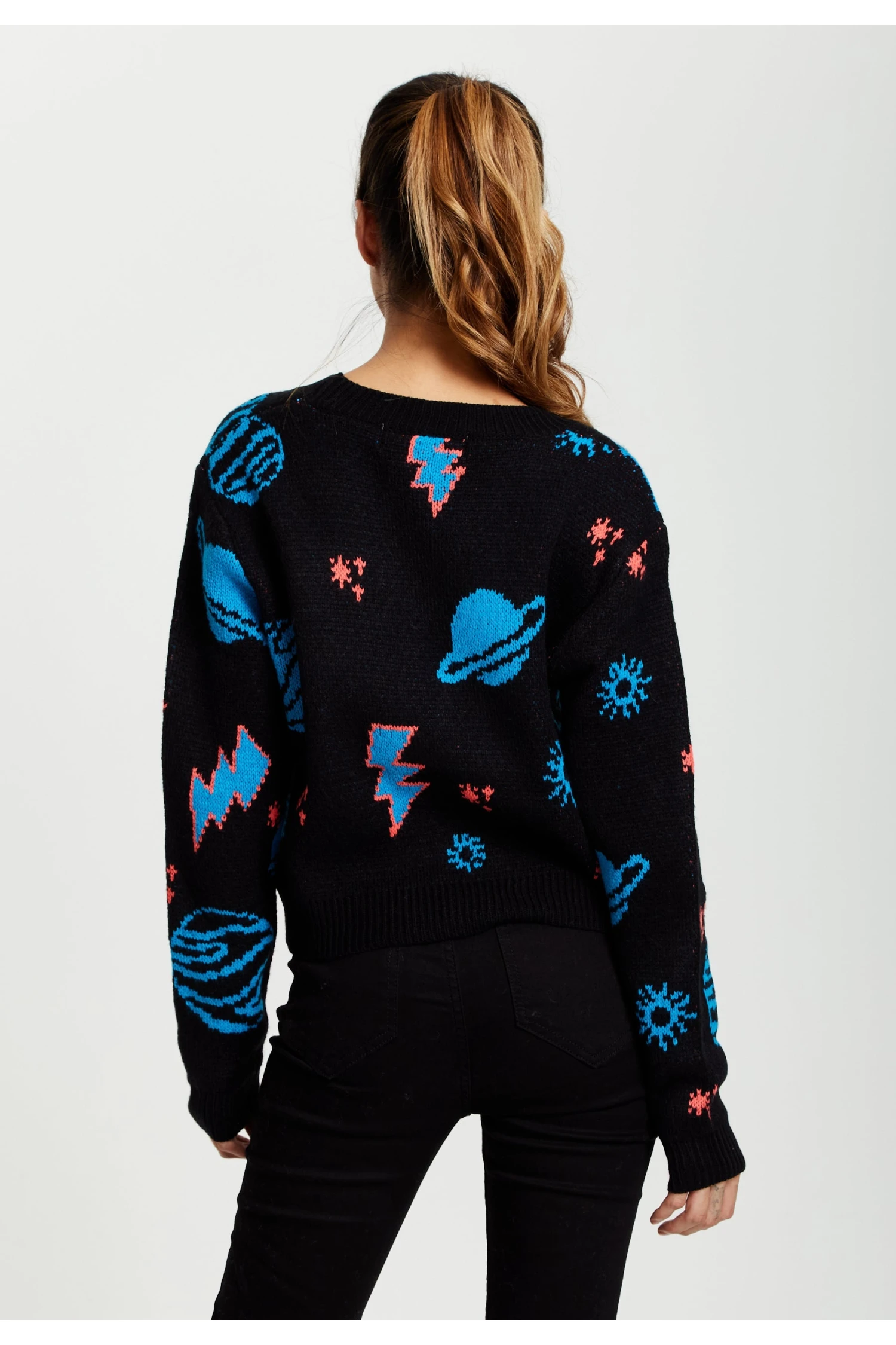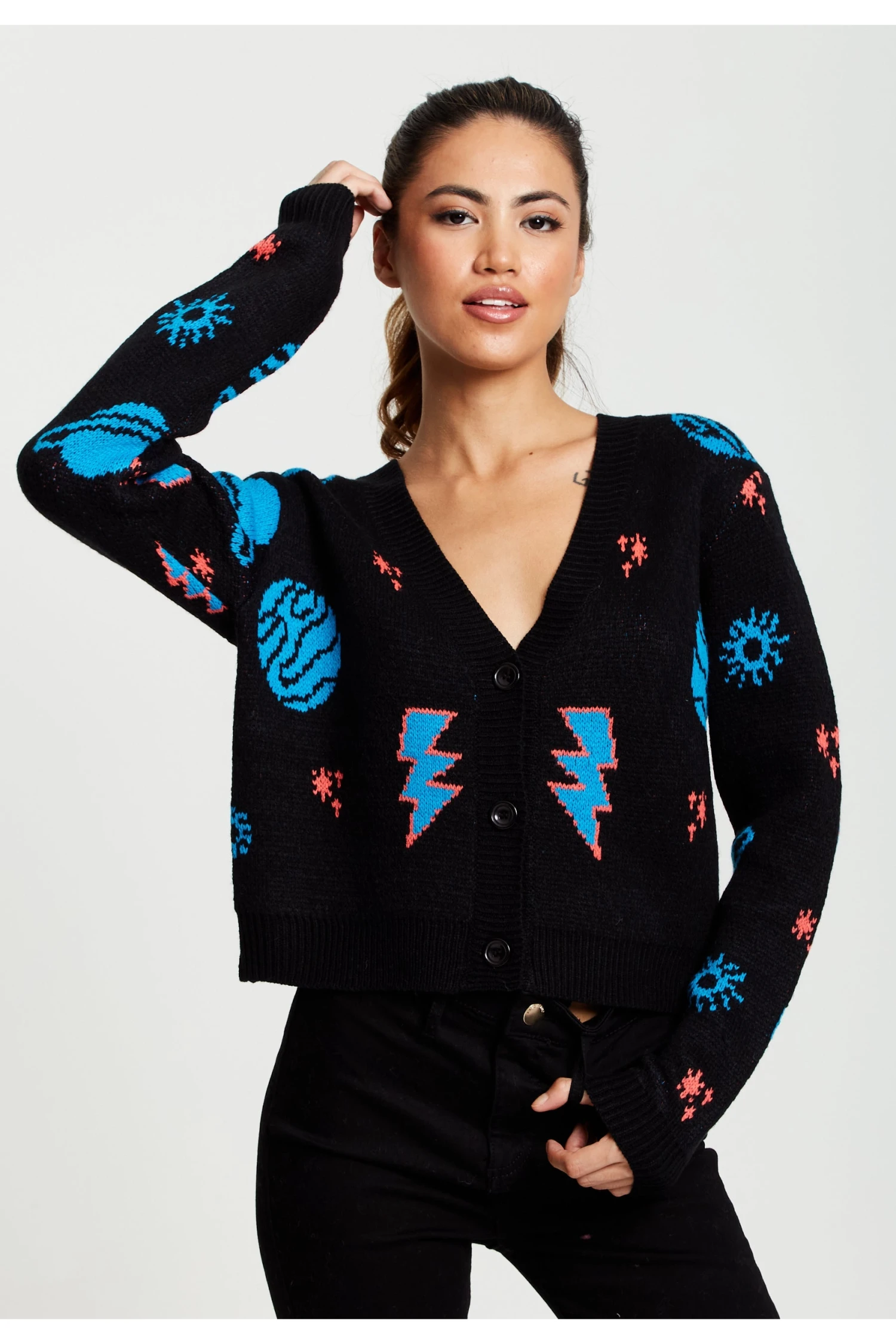 Featuring a cosmic pattern that is out of this world the V- Neck cardigan has button-down detail, ribbed waistband and cuffs. Cozy and casual wherever you wear it.