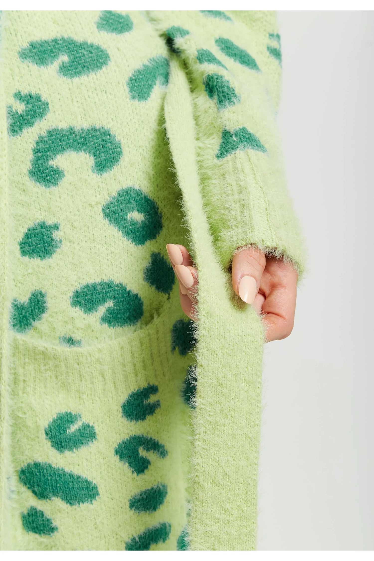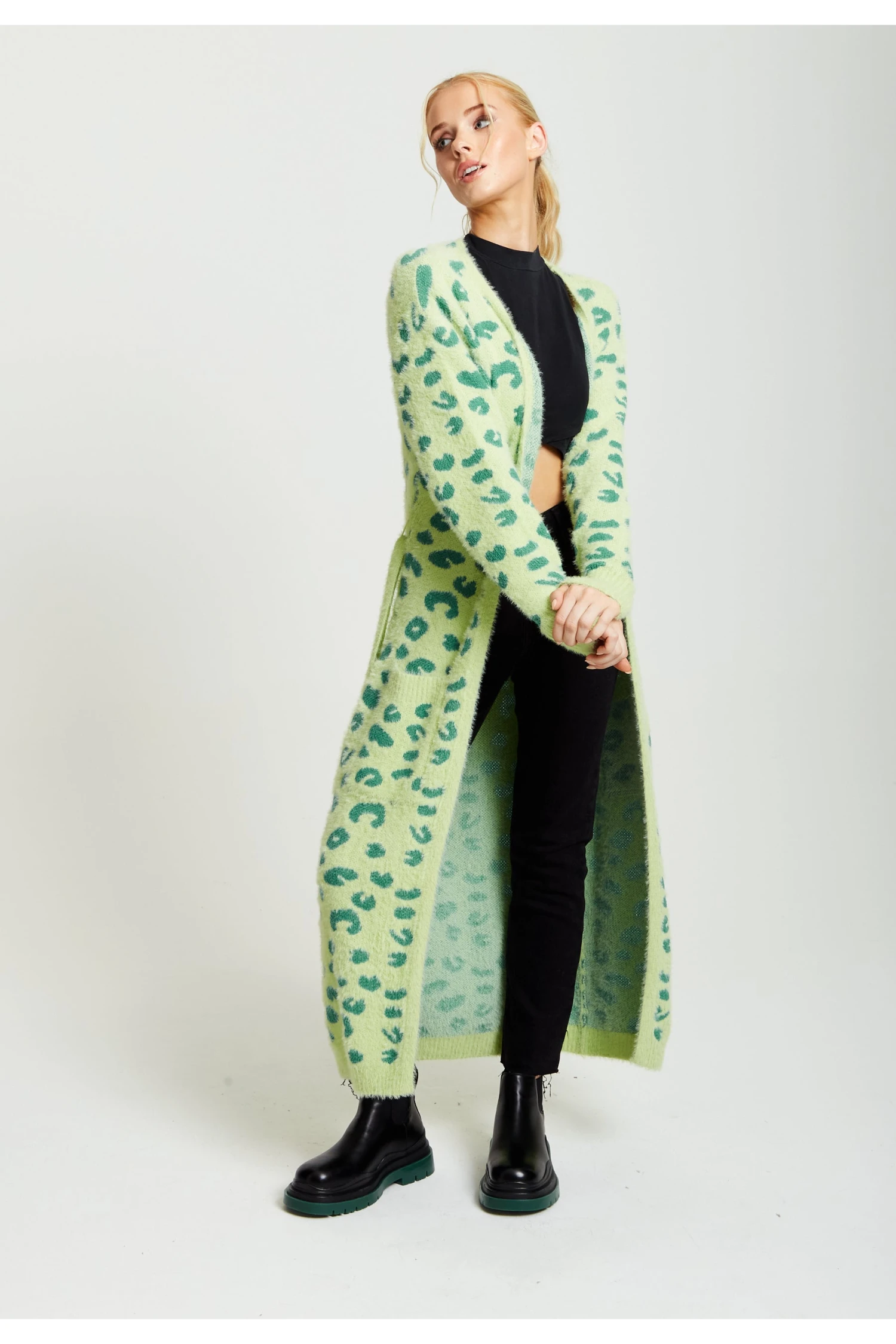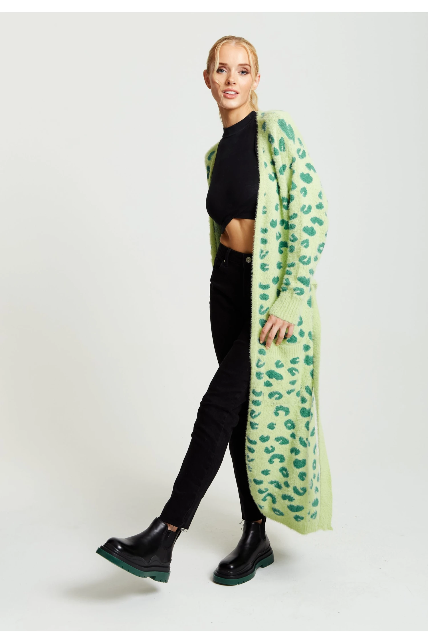 Liquorish Fluffy Longline Cardigan In Green Animal Print