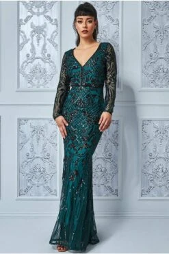 Goddiva Bardot Sequin Embroidered Maxi Dress – Emerald Green