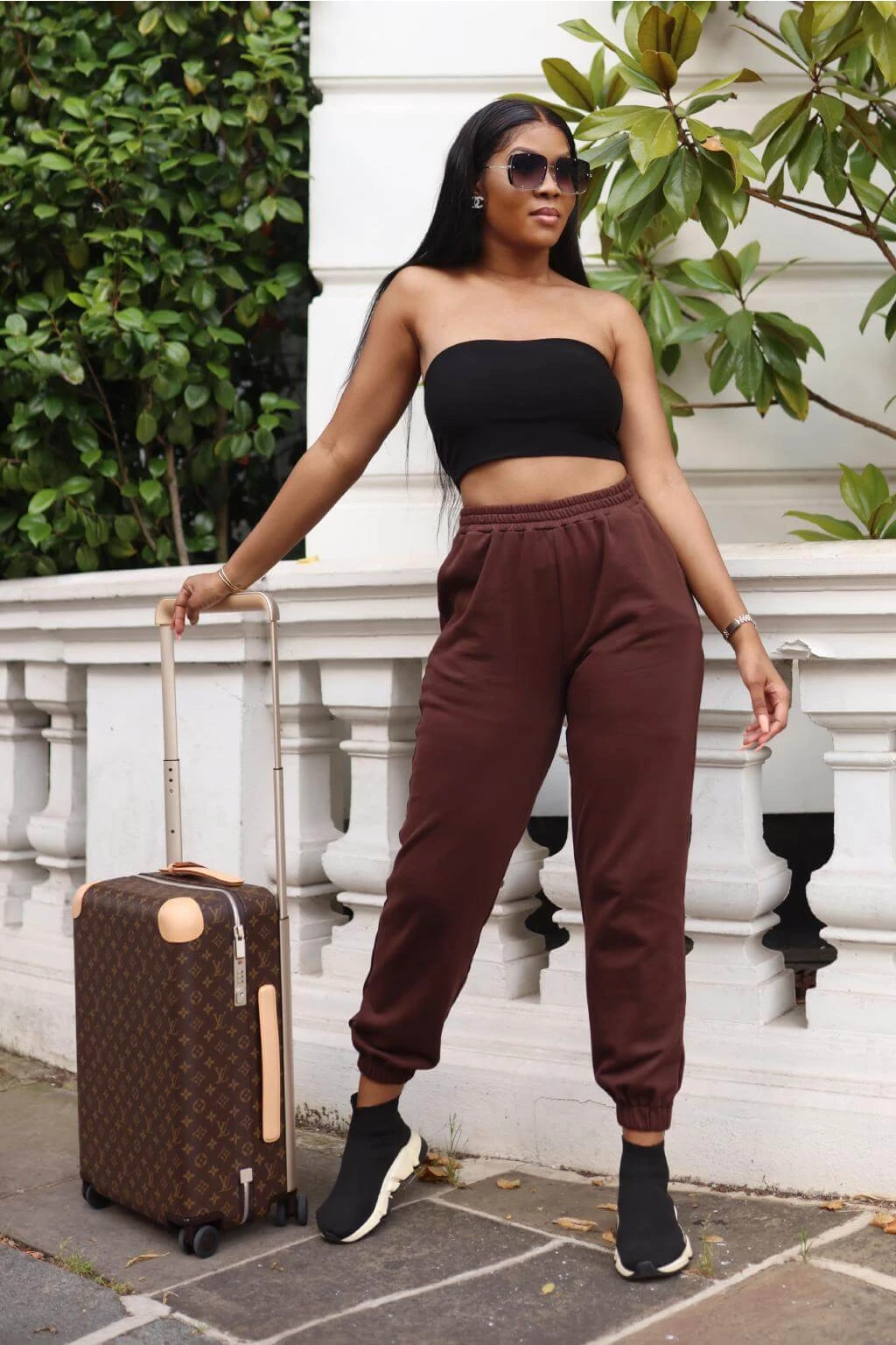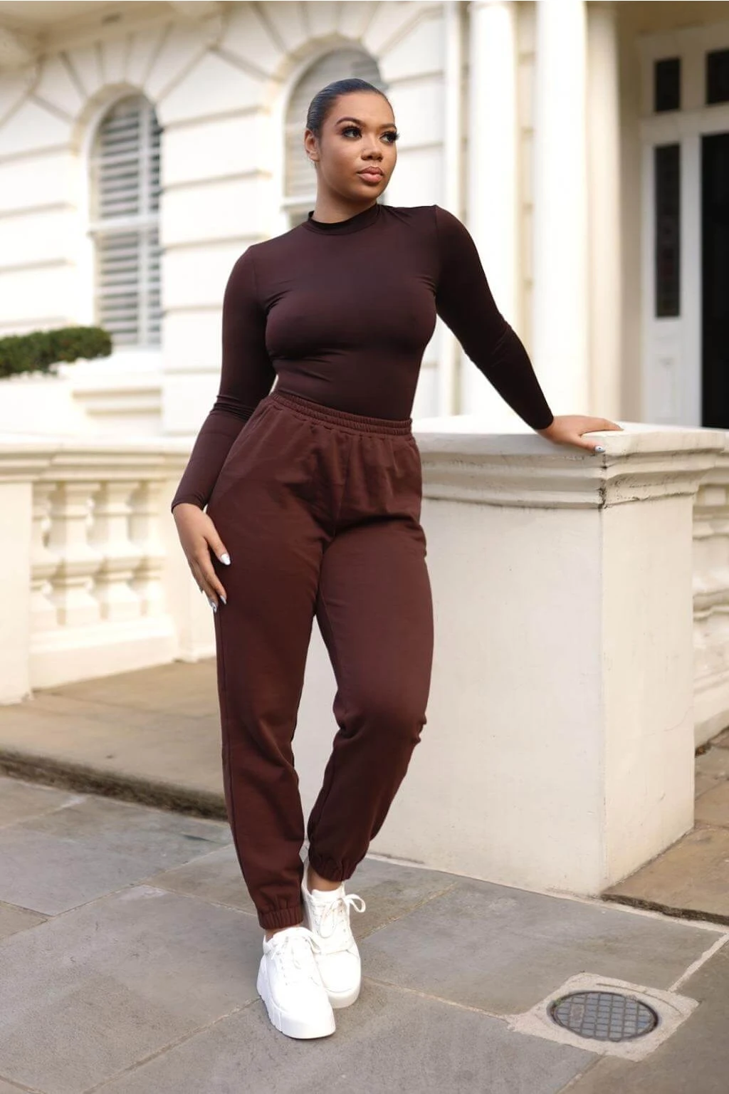 Hot, sexy and comfortable, our brown joggers for women will easily be your go-to. Given the quality of breathable cotton material, these dark brown joggers are super soft on your skin, the oversized fit makes them super comfortable and flattering. Featuring two side pockets and an elastic waistband to contour your waist, these details give you that luxurious look. These baggy chocolate joggers for women are in-style, very stylish and super easy to style. In other words, you can literally wear them with anything in your wardrobe. For a stylish yet comfortable look pair them with our Chocolate Bodysuit, a killer celebrity look. You can also pair them with tank tops, hoodies and your favourite pair of trainers for that chic look. For a dress-up pair them with our Chocolate Bodysuit and heels. You need to resist the temptation to buy more than one of these. Because, once you’ve tried them, it won’t be easy getting yourself to part with them.