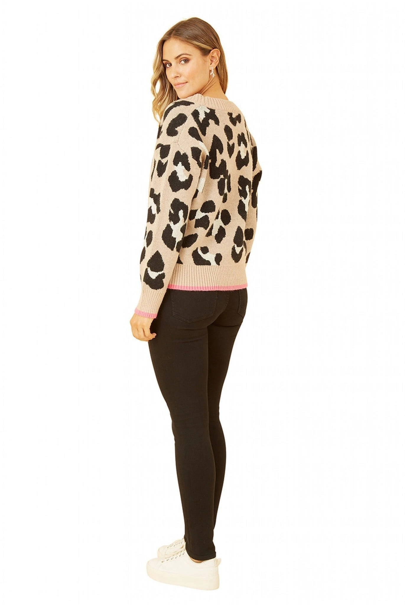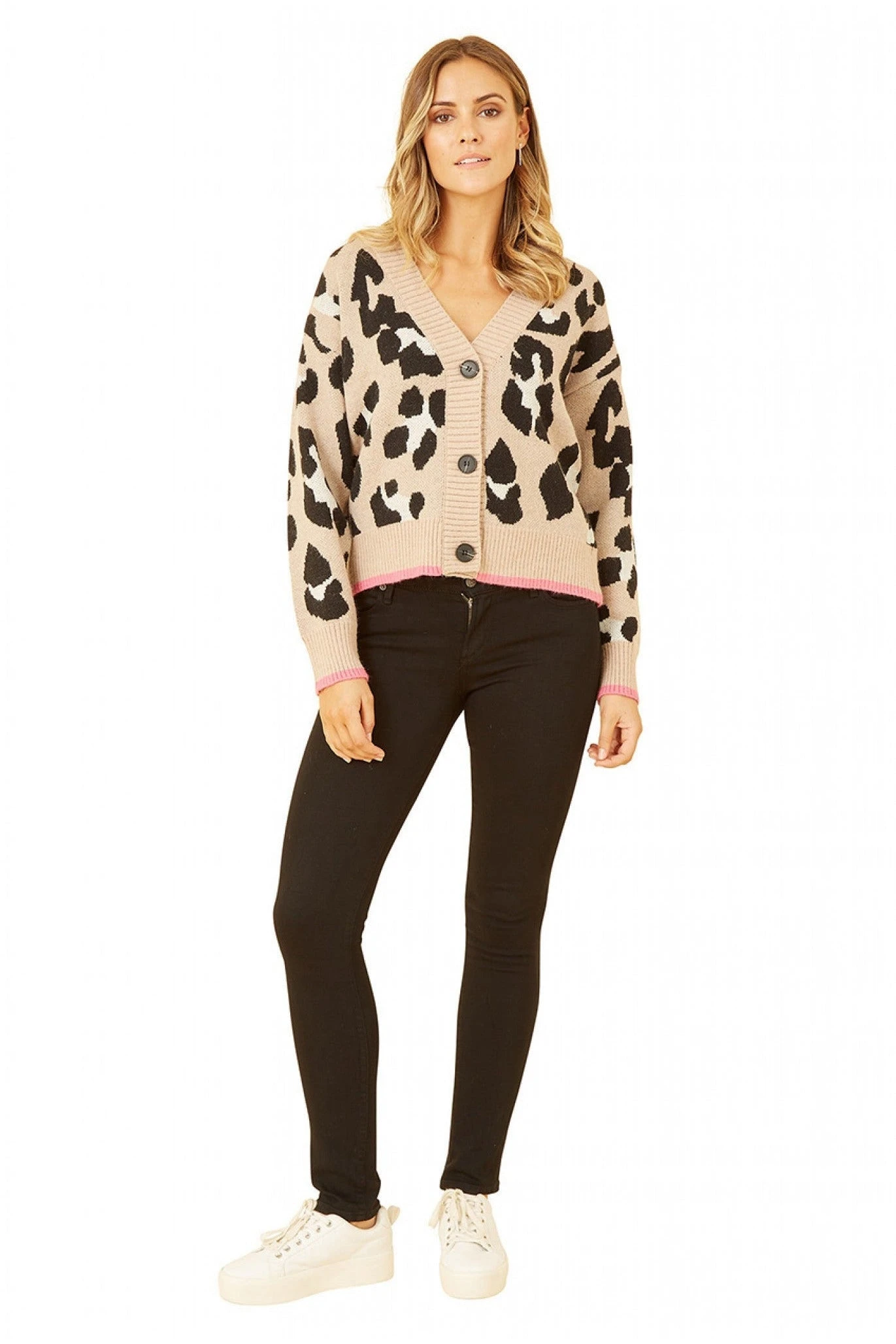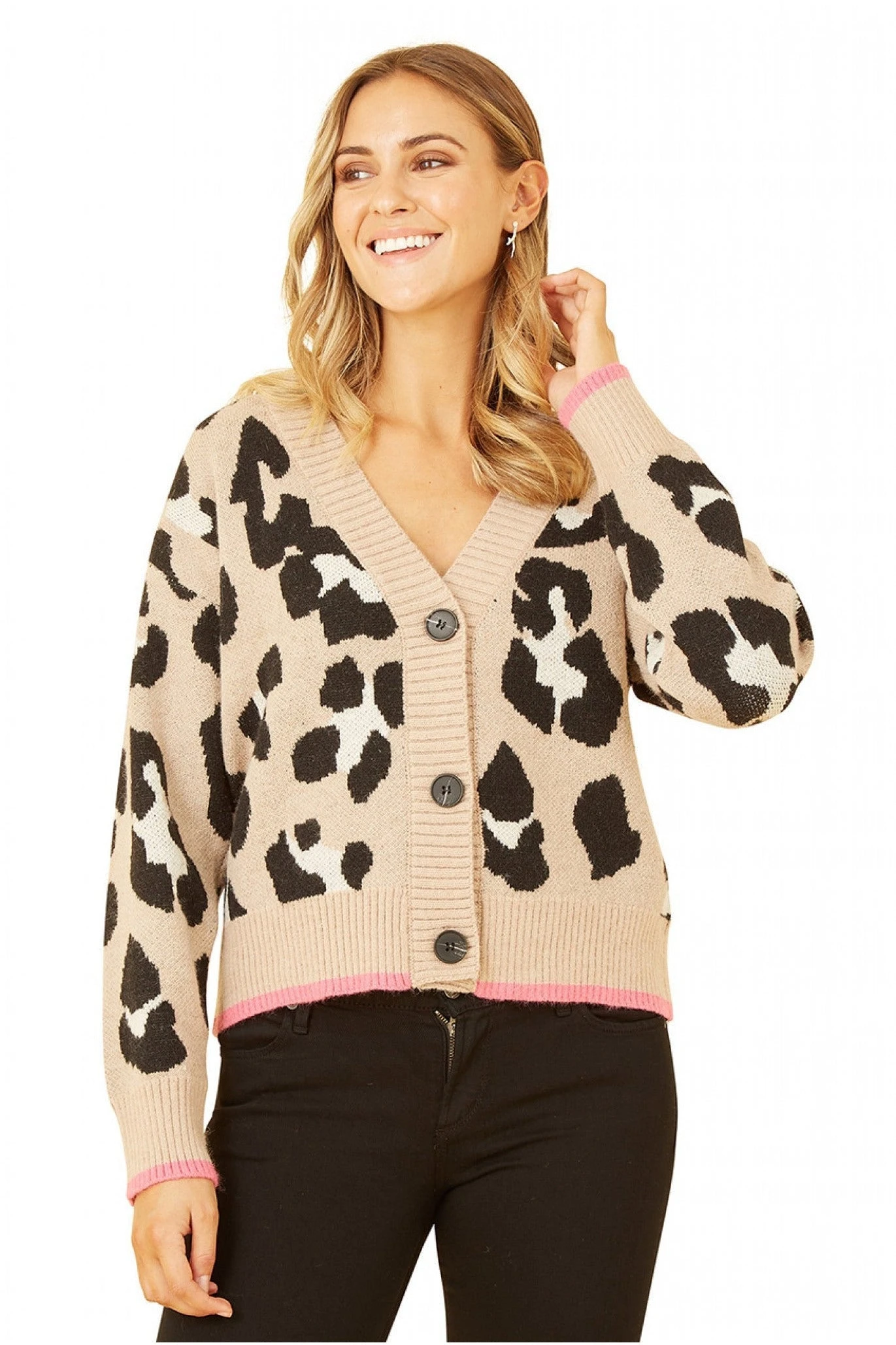 The animal print on this Yumi Beige Oversize Animal Print Intarsia Knitted Cardigan is bang on trend, with the pink hemming on the cuff and hem really elevating this everyday piece. This simple button up would style well with black leather trousers, trainers and a plain T-shirt.
