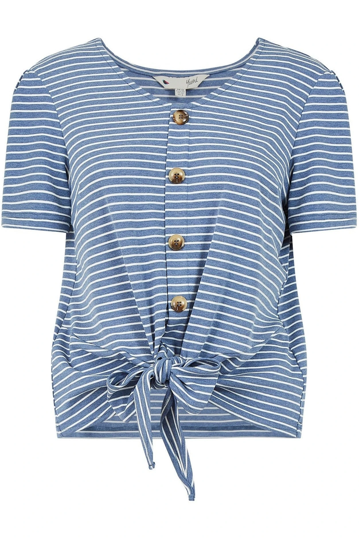 Add a classic look to your wardrobe with this striped jersey top from Yumi. Cut from super soft cotton, with a button front, it’s styled with a tie on the hemline for a sweet finish.