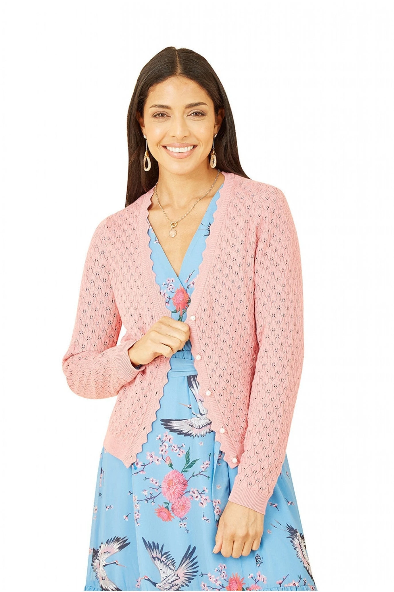 Perfect for layering any outfit, opt for this classic blush cardigan from Yumi. Made from soft, stretchy and supple fabric, it comes in a traditional shape. Updated with pointelle stitching, it’s designed with button fastenings on the front for a beautiful finish.