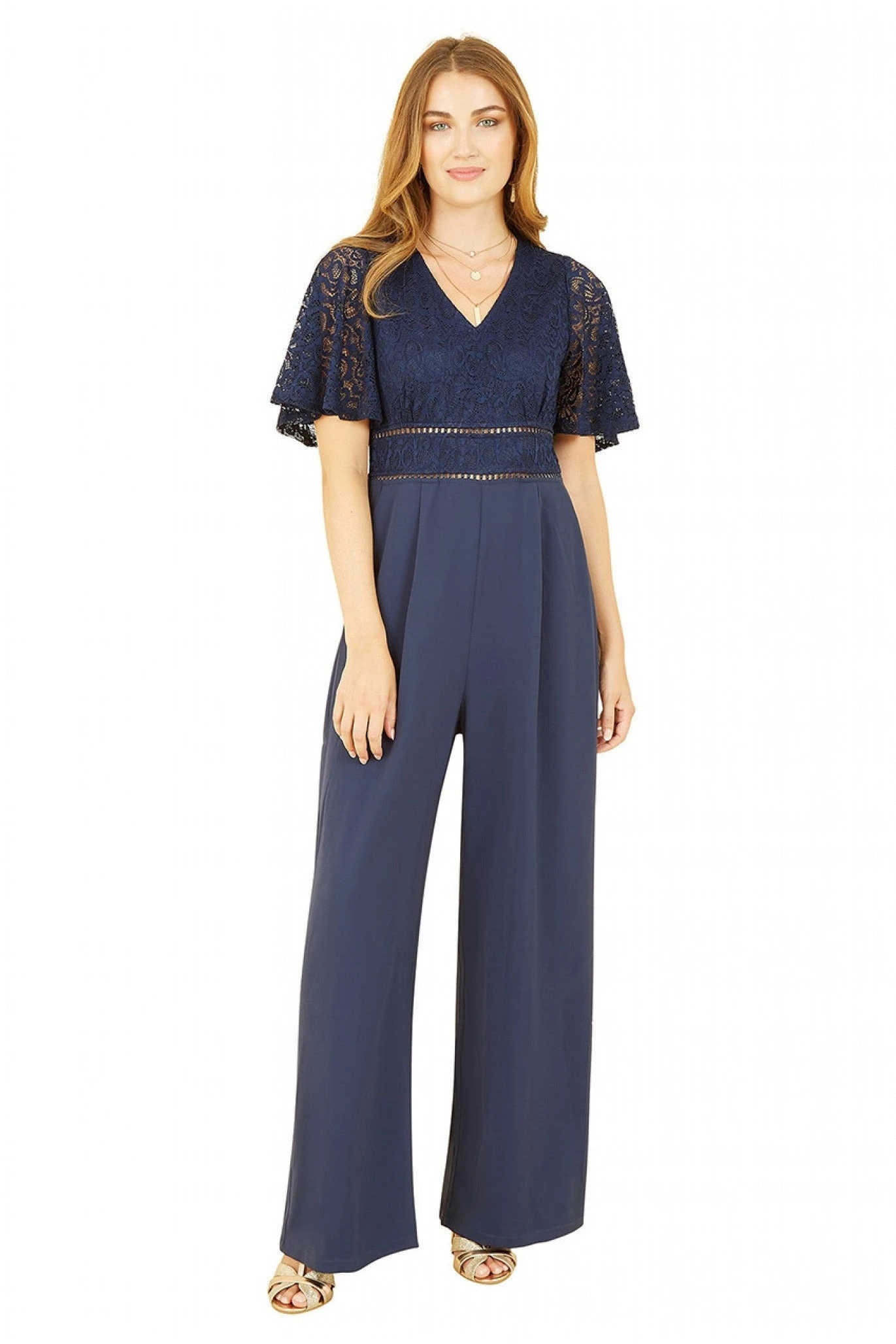 Chic and stylish, this navy Yumi jumpsuit is the perfect add in to your wardrobe for invites all season. The lace bodice has a V neckline, detailing at the waist and fluttery kimono sleeves. The long wide legs are flattering and offer a simple and elegant shape. Style with simple strappy heels and jewellery for any occasion.