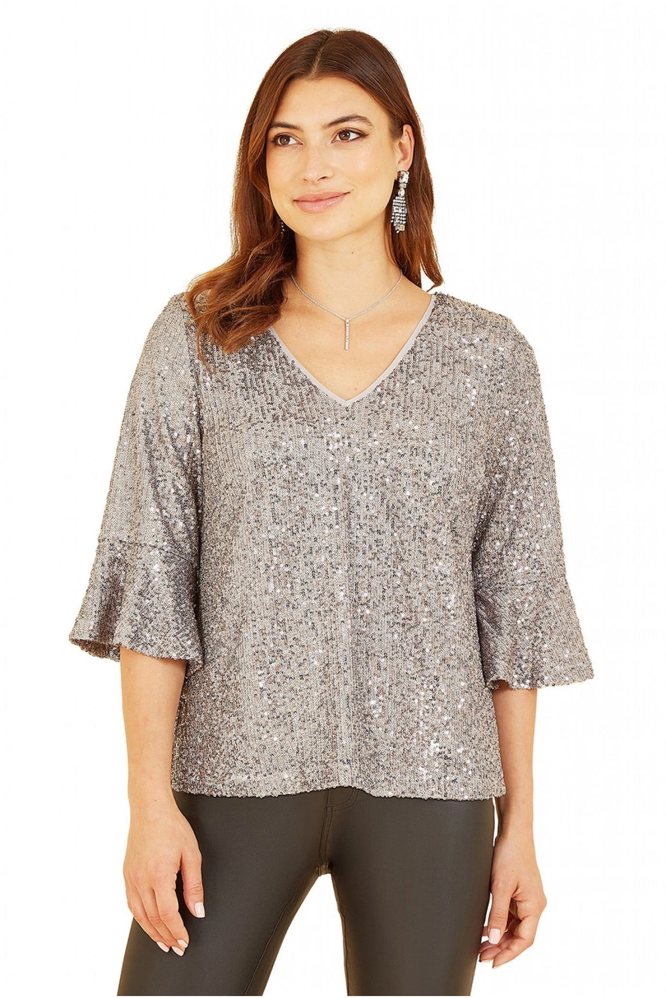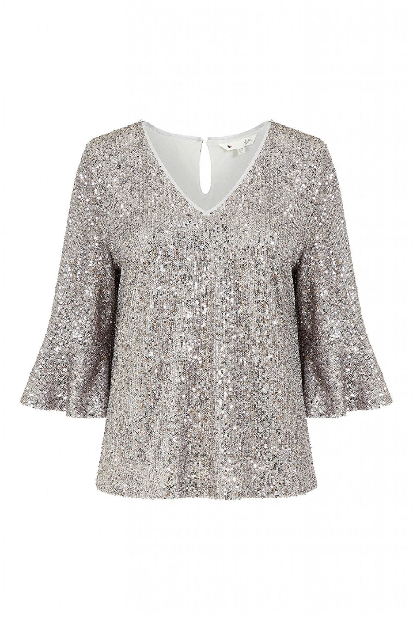 Yumi Silver Sequin Top With Fluted Sleeve
